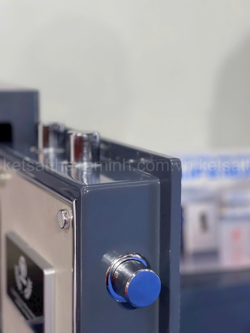 - Bên dưới là phần tay nắm hình vuông có viền bạc. Dòng tay nắm bán trợ lực nên rất nhẹ và rất dễ thao tác. Không bị đẩy lại khi đóng mở két.