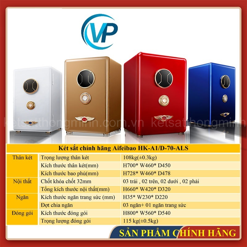 Két sắt thông minh HK-A1/D-70-ALS là mẫu két sắt vân tay cao cấp của Aifeibao được nhiều khách hàng lựa chọn nhờ mẫu mã sang trọng, nhiều màu sắc quý phái, kết cấu dày dặn, có ngăn đựng trang sức.