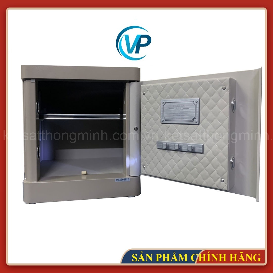 Nội thất được chọn dùng loại da PU màu xám không bóng tróc. Phần dưới còn được lót một lớp xốp mềm chống sốc bảo về tài sản bên trong và không bị đau tay khi đặt vào hoặc lấy tài sản ra. Phần cánh cửa còn được trần hình quả trám rất tinh tế, tại điểm nhấn cho két và cũng là bảo vệ tài sản bên trong. Ngoài ra còn móc treo đồ nhỏ để treo chìa khóa hoặc một số đồ vật nhỏ.